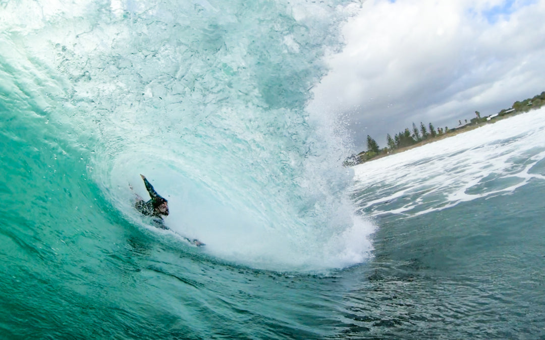 You’ve committed to the wave, you’ve navigated the drop and you’ve set your line for the barrel. Now some people at this point will try to pull out through the back of the wave, but this can often result in the body surfer being sucked up and over with the wave crashing down into the shallow water bum, back, shoulder or worse neck first, especially on the bigger days. DON’T DO THIS. The safest place to be when body surfing shore breaks is inside the barrel. Here the main energy of the wave is throwing over the top of you. And when the barrel eventually collapses you’re instantly surrounded by millions of cushiony bubbles. The lip of the wave crashing Infront of you has also washed up the sand a bit making it less of hard surface and more of a softer mix of sand and water. Not to mention that being inside the barrel is also the best view on the planet.