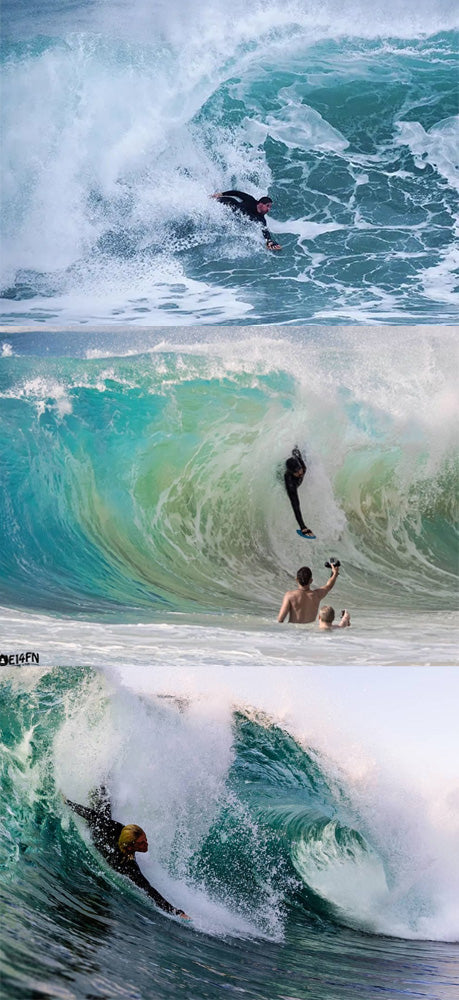 If the waves are big and fat (not large but not very steep) you will need to swim hard to get on it. The trick with the bigger waves is to keep on paddling and kicking until you’re are definitely on the wave , if you stop before this point you’re likely to fall off the back the wave and it will proceed unridden, and you’ll be left vulnerable to the next wave on the head. Once up and riding the principles of bodysurfing are the same as riding the smaller waves in that you want to trim across the wave, maintaining a nice high line. The main difference here is the larger waves will give you much more speed, especially when using a body surfing hand plane, which in fact makes it easier to body surf the bigger waves in many ways than the smaller weaker waves. If the wave steepens and gets near vertical, try dropping down the waves face bit to avoid being ‘bucked off’ and loosing connection to the wave, but not too far down, use your handplane to stall your descent, as this may put you at risk of being hit in the back of the head by the falling lip of the wave. You’ll inevitably do both at some stage and you’ll soon work where the sweet spot is.